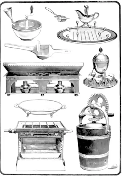 Mayonnaise Mixer, Mincer, Asparagus Dish. Masher and Strainer, Egg Boiler, Table Hot Plate, Hot Water Dish, Gas Grilling Stove, Cream Freezer.