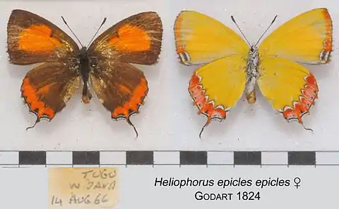 - Heliophorus epicles (Godart); Moore, 1910: 103; Fruhstorfer, 1918: 48; Bridges, 1994: IX.48.