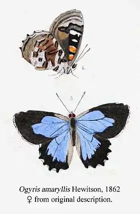 - Ogyris amaryllis Hewitson, 1962: 3, pl. I, figs 5, 6; Miskin, 1890: 26; Waterhouse, 1902: 336, pl. 14, Figs 3, 4; et seq.