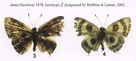 Lectotype: ♂ ZMHU, "SYN-/TYPE"/"Duma"/"Bogota/NoIcken.", designated by Robbins & Lamas, 2002: 200, figs 3, 4.