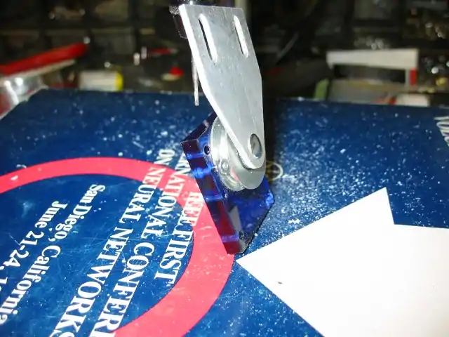 To do this align the rollers center of rotation with the center of rotation for the Plexiglas arm. This is about 8 mm back from the leading edge of the "tilt bottom" part. The first step is finding the center. Then you will have to decide where to drill three holes to connect this part to the "tilt bottom" part. This is the most difficult part and requires some solid measurements to make sure you center the piece correctly. You will also need to bevel an indentation as shown below so that swivel in the screen door roller has room to breath. Since this bevel will be hidden, it doesn't need to be pretty.