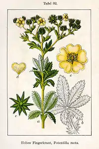 |  Illustration Wikipedia • Commons • Wikibooks (horticulture) • Wikibooks (subject) • Wikispecies • Fruit and seed clock | Profile for Potentilla recta  (Rough-leaved Cinquefoil)
