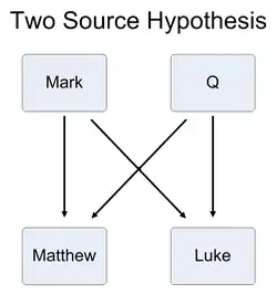 The Two-source hypothesis (or 2SH) is an explanation for the synoptic problem, the pattern of similarities and differences between the three Synoptic Gospels (Matthew, Mark, and Luke). It posits that the Gospel of Matthew and the Gospel of Luke were based on the Gospel of Mark and a hypothetical sayings collection from the Christian Oral Tradition called Q.