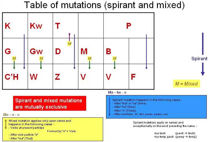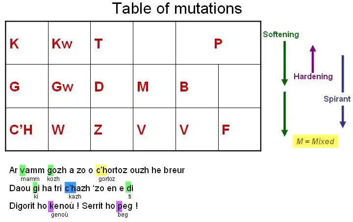 Table of mutationsMutations in Breton obey to regular phonetics laws. They are summarized in the table below (details to be found in the rest of this page) :