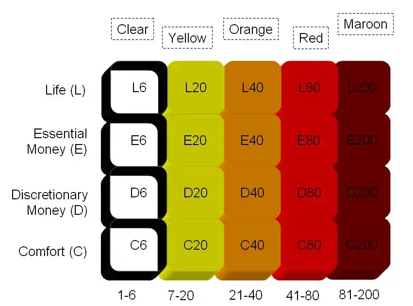 Comfort (C) Discretionary Money (D) Essential Money (E) Life (L)