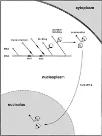 "The model proposed [in the image on the right] is based on expression results obtained [...] with various box C/D snoRNAs in different cells and in different genetic contexts. The major features are predicted to be universal for all box C/D snoRNAs. Variations are likely to occur in the early steps, due to differences in genomic arrangements, i.e. introns of protein genes, or mono- or polycistronic snoRNA transcription units. Transcription occurs in the nucleoplasm. Folding of the precursor produces a functional box C/D motif. This motif is then recognized by a box C/D snoRNA family-specific binding protein(s). These events occur during (as depicted), or rapidly after transcription. A transcript then follows one of two possible pathways: (i) a precursor capped with monomethylguanosine (open circle) is hypermethylated to yield trimethylguanosine (closed circle) and trimmed at the 3' end by exonucleases, or (ii) if uncapped, the precursor is trimmed at both ends. In both cases, protein binding via the box C/D motif is then responsible for the delivery of the snoRNA to the nucleolus."[1]