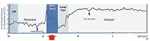 "Excess 14C in Cariaco Basin sediments indicates a slowing in thermohaline circulation and heat transport to the North Atlantic at that time, and both marine and terrestrial paleoclimate proxy records around the North Atlantic show a short-lived (<400 yr) cold event (Intra-Allerød cold period) that began ca. 13,350 yr B.P."[4]