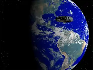 In the Bryce animation example (above) the Starfield sky preset was used with no ground plane. Earth was created as a sphere  but the Moon was simply a flat "billboard" object. The space ship is a simple torus.