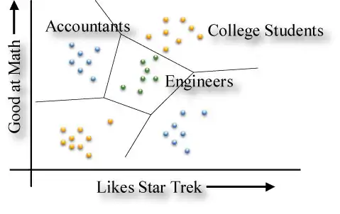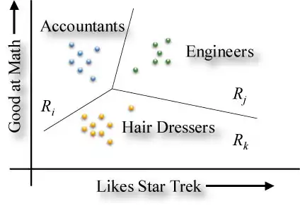 You look at the plot and you see that if you draw a few lines, you can create borders between the groups of people. This is very handy; if you grabbed another person off the street and gave them the same Math and Star Trek test, ideally they should score similarly to their peers. As such, as you add more samples, people's scores should fall close to what other people who share the same profession score. Note that in our example, we can classify people with total accuracy, whereas in the real world noise and errors might make things much more messy.