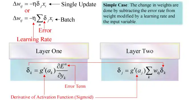 Where is the output we got, while is what we wanted to get. Thus, we compute how different the network output was from what we wanted it to be. Additionally, in this example, we use a simple update based on the general error.