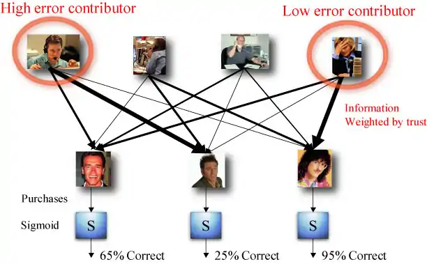 There are many ways in which we can adjust the trust weights, but we will use a very simple method here. Each time we place some insider information, we watch the trades that come from our rich dudes. If there is a large error coming from one rich dude, then they are getting bad information from someone they trust too much or are not getting good information from someone they should trust more. When the mad scientist sees this, he uses the Trust 'o' Vac 2000 to weaken a strong trust by a little and strengthen a weak trust by a little. Thus, we try to slowly cut off the source of bad information and increase the source of good information going to the rich dudes.