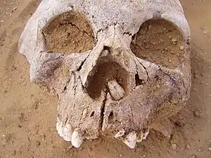 "Sahelanthropus tchadensis is one of the oldest known species in the human family tree. This species lived sometime between 7 and 6 million years ago in West-Central Africa (Chad). Walking upright may have helped this species survive in diverse habitats, including forests and grasslands. Although we have only cranial material from Sahelanthropus, studies so far show this species had a combination of ape-like and human-like features. Ape-like features included a small brain (even slightly smaller than a chimpanzee’s), sloping face, very prominent browridges, and elongated skull. Human-like features included small canine teeth, a short middle part of the face, and a spinal cord opening underneath the skull instead of towards the back as seen in non-bipedal apes."[31]