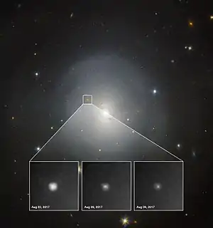 - ↑ Anderson, Paul Scott (28 June 2018). Astronomers see mystery explosion 200 million light-years away - Supernovae, or exploding stars, are relatively common. But now astronomers have observed a baffling new type of cosmic explosion, believed to be some 10 to 100 times brighter than an ordinary supernova, In: Earth & Sky. Retrieved 25 September 2018.