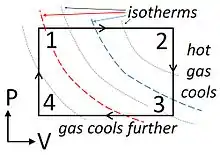 To understand why heat,, and work are not state variables,we introduce the heat engine, which is a cycle that converts heat into work (or it can act as a heat pump if the cycle is reversed.) Since only two state variables are independent, it is possible to fully specify a system as a point on a two dimensional graph, for example on the P-V (pressure-volume) diagram shown in the figure. The other state variable (T) can be depicted using contours on the graph. Contours of constant temperature are called isotherms. For the ideal gas, these contours are hyperbolas, but we are not restricting our discussion to the ideal gas.