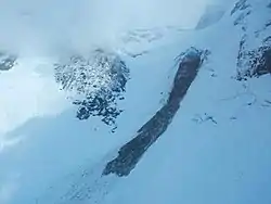 "On a summit flight, we were able to see the source of the meltwater stream. It appears to starts to the right of the dome where a fall face can be seen and continues down."[3]