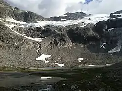 On the lower left is the Redoubt Glacier and below it is Ouzel Lake which the glacier drains into. The image is dated to August so the glacier has probably retreated from its winter advance maximum.