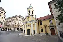 - 🌍 Chapel of St Roch (Szent Rókus kápolna), VIII. Rákóczi út 31. (trolley 74 to stop Nagy Diófa utca, bus 5, 7, 8E, 107, 108E, 110, 112, 133E to stop Uránia, or M2 Blaha Lujza tér and ten mins walk), [email protected]. M-Th 06:50-17:45, F 06:50-12:00. Built as part of the Hospital of St Roch. Already in 4th century was here a small, early Christian, so called "trichora" form, similar like in Pécs, (which is a part of the UNESCO World Heritage list), cemetery chapel.(not proved). In fact in 1711 built a chapel for the patron saint of St Roch (to eliminate the devastating plague). Expanded after the 1739-40 plague epidemic, giving thanks to God and the patron Saint, because this epdemic avoided Pest City. In 1746 the city council had built a hermitage on the back wall of the sanctuary. The last hermit of St Roch, Andreas, died in 1810, and was buried in the Servite's crypt. Between 1751 and 1765 built the tower and the sacred statues of the facade. This place became a permanent center annual ceremonies and processions. In 1797, at the time of built the Public Hospital,- the chapel was renovated, a music gallery was built over the entrance, developed the final form of the spire, two new bells was donated by Vicar Board. The sanctuary is decorated with monumental painted stone images, made by Esther Matthioni in 1963. On the left wall is the image of St Roch, and on the right the image of St Rosalia. On pedestal of the new altar is a wood sculpture composition. There is on left St Roch with a stick and a dog, on right plague patients, on the back the cave of Nativity (at Christmas time it is turned for front side). The crypt decoration also works of Mattioni Esther: The painted Agnus Dei stone altar, on the floor pics of the seasons with zodiac and Christian symbols. The shrine valuable objects are: the relic of tree of the Cross of Christ, and relics Saints of Roch, Sebastian and Rosalie. A particularly valuable treasure is a silver chalice, made around mid 18th century decorated with pictures of the three "plague" Saints of Roch, Sebastian and Rosalie. Over the side of the altar is an image of Mary of Częstochowa (Poland) in 18th century, At the entrance is a statue of Mary also in 18th century, Outside column before ake the chapel is a statue of the Immaculata (the memory of the publication of Immaculate Conception dogma) made in 1867. Also at the entrance can be found a statuette of Miraculous medal of the Immaculate Virgin, a work of Károly Antal, in 1944. Right next to chapel is a stone cross. The facade decorated with statues of the saints (Roch, Gellert, John of Nepomuk, Laszlo, Elizabeth, Stephen, Margaret, Emeric and Rosalia). On the left (of the facade) placed a memory plate about the Big Pest flood (1838).