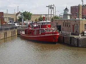 - π Edward M. Cotter, moored at north end of Michigan Avenue Lift Bridge (Metro Bus 14, 16 or 42). Sometimes open for tours during festival appearances. The 118-foot (36-m) Edward M. Cotter is the oldest fireboat in the world still on active duty, and is inscribed on the National Register of Historic Places and as a National Historic Landmark. Launched in 1900, the boat was originally named the William Grattan after Buffalo's fire commissioner at the time. After it suffered a devastating explosion in 1928 (flying sparks from a burning oil barge entered its fuel tank), it was rebuilt from the burned-out shell of its hull at a cost of nearly $100,000. With a maximum speed of about 15 miles per hour (24 km/h), the Cotter is the slowest piece of firefighting machinery the Buffalo Fire Department owns, but it's indispensable for its ability to reach places on the waterfront inaccessible to ordinary fire trucks, and it has ten times the water-pumping capacity of the average fire truck. Over the years, the Cotter has seen action such as going across the lake to Port Colborne in 1960 to help fight a fire at a grain elevator complex; helping keep afloat the Buffalo Naval and Military Park's USS Little Rock after it began taking on water in 1978, and towing the Polish ship Zawisza Czarny off of a sandbar when it came to Buffalo Harbor for a visit in 1983. During the quiet winter months, the Cotter serves double duty as an icebreaker on the Buffalo River; during the summer, it can frequently be seen at local waterfront festivals and boat shows, where tours are also offered.