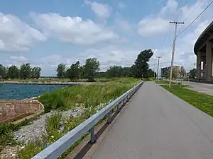 The showpiece of South Buffalo's bicycle infrastructure is the Industrial Heritage Trail, the Outer Harbor leg of the Shoreline Trail that runs along the waterfront all the way to North Tonawanda. Completed in 2010, this waterfront path extends along the shore of Lake Erie from the Coast Guard station southward along the waterfront into Lackawanna, passing by or through waterfront attractions such as Times Beach, Buffalo Harbor State Park, Tifft Nature Preserve, and Ship Canal Commons. The Shoreline Trail continues to downtown and the more northerly waterfront via Ohio Street and South Park Avenue, mostly along off-street paths (including a particularly interesting stretch on the shore of the Buffalo River behind the old DL&W Train Sheds that gives you an up-close-and-personal look at the grain elevators), with the exception of a few stretches along Ohio Street with dedicated on-street bike lanes. From Memorial Day through Columbus Day, you can also get to the Outer Harbor from Canalside via the Queen City Bike Ferry; the fare is $1.