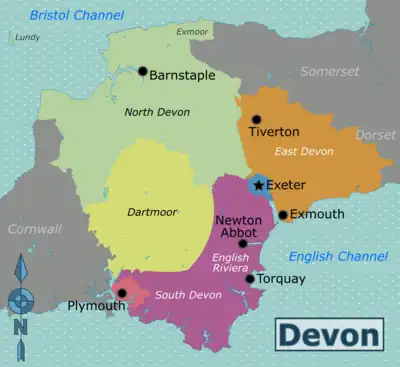 | North Devon (Barnstaple, Ilfracombe) Covers the area west of the River Exe that lies between Dartmoor and the Bristol Channel. It is largely farming area with market towns and a number of holiday resorts on the north coast. Part of Exmoor lies within the region. |