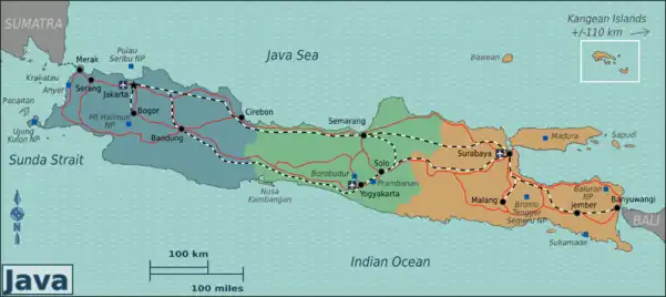 Java (Indonesian: Jawa) is an island in Indonesia. The much smaller but still sizable island of Madura, off the coast of and covered as part of the region of East Java, is also included in this article.