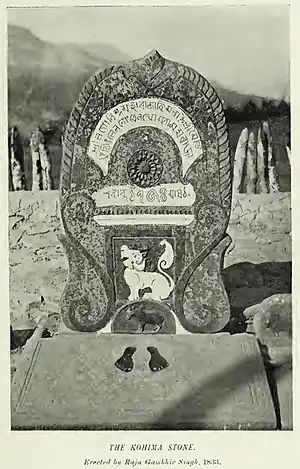 King Raja Gambhir Singh (alias Chinglen Nongdrenkhomba) of Manipur kingdom recaptured Nagaland in 1832 AD after some gap of declining Manipuri influences over the Nagas due to the Burmese war of 1819–25. He engraved a historic stone inscription in the Naga capital of Kohima (Meitei: Thibommei) in 1833. The inscription mark the Meitei conquest and supremacy over the Naga Hills in 1832. It is known as the Kohima Stone Inscription or the Gambhir Singh's Stone.