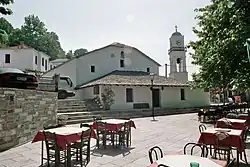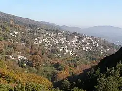 Milies, Vizitza, Pinakates (Greek: Μηλιές, Βυζίτσα, Πινακάτες) are villages in municipality of South Pelion on Mount Pelion in Greece. Since these villages are close to each other, they are considered as a single travel destination. As a tourist destination belongs to Northwest Pelion. It is a traditional Greek mountain village, at a height of 400 m. It is 28 km from Volos, the capital city of the prefecture of Magnesia. Milies is connected with the GR-34A (Volos - Promiri) It has traditional stone houses, cobbled roads, good restaurants and accommodation in abundance. Milies is also notable for being the terminus of the narrow gauge (60 cm) Pelion Railway, built by the Italian engineer, Evaristo de Chirico, (father of the famous painter) between 1895 and 1903. This proved to be of considerable economic advantage to the region. The village commands striking views across the Pagasitikos Gulf and benefits from the many streams and water sources that Mount Pelion is renowned for. These result in rich vegetation and cool, forested mountain slopes.