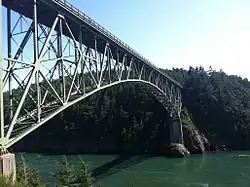 - π Deception Pass Bridge,. A National Historic Monument since 1982, is actually two spans that link Whidbey Island near Oak Harbor to Fidalgo Island over Canoe Pass and Deception Pass. The bridge, one of the scenic wonders and destinations of the Pacific Northwest, was a Public Works Administration project built by the Civilian Conservation Corps. (updated Jun 2023)