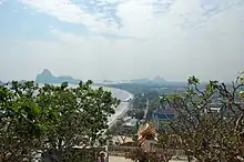 - 🌍 Ao Manao Beach (อ่าวมะนาว) (several kilometres south of the town). It is on Wing 5, an air force base, so you must pass by guard posts at either end to get to the beach. This is a formality. Just slow down, salute, and get waved through. Chaises longues and beach umbrellas can be rented for 20 baht. Ao Manao was a battlefield in World War II between Thai and Japanese armies. It is a clean beach suitable for swimming. Opposite the beach stands Khao Lom Muak. At ebb tide, a long sand bar will appear. At the summit of Khao Lom Muak, there is a replica of the Buddha's footprint. At the foot of the mountain stands a shrine of Chaopho Khao Lom Muak. On Ao Manao you can ride horses, do some archery and have a Western BBQ. Free. (updated May 2018)