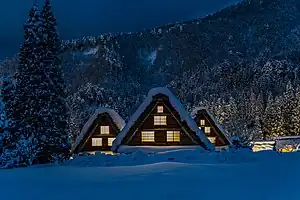 The village is famous for its farmhouses, which are built in a unique architectural style known as gasshō (合掌). The name means "hands together" as in prayer, referring to the steep roofs that keep the snow off in the winter. Underneath the roofs, the large attic area was used to house silkworms.