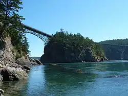 - The aptly named Deception Pass is a dramatic seascape where the tidal flow and whirlpools beneath the twin bridges connecting Fidalgo Island to Whidbey Island move quickly. During low tides, the swift current can lead to standing waves, large whirlpools, and roiling eddies. This swift current phenomenon can be viewed from the twin bridges' pedestrian walkways or from the trail leading below the larger south bridge from the parking lot on the Whidbey Island side. Boats can be seen waiting on either side of the pass for the current to stop or change direction before going through. Thrill-seeking kayakers go there during large tide changes to surf the standing waves and brave the class 2 and 3 rapid conditions. This area is for experienced boaters only.