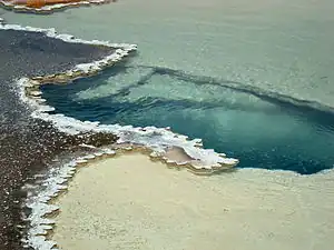 - 🌍 West Thumb Geyser Basin. This geyser basin is situated along the shore for a distance of 2 miles (3.2 km), extending back from it about 500 yards (460 m) and into the lake perhaps as many feet. There are several hundred springs here, varying in size from miniature fountains to pools or wells 75 feet (23 m) in diameter and of great depth. Additionally, a small cluster of mud springs. Of particular note, the Abyss Pool offers an optical illusion that makes it look bottomless, and Fishing Cone is a offshore pool which was once popular as a spot to cook newly-caught fish by dipping them into this partially submerged hot spring. (This stunt is no longer allowed.).