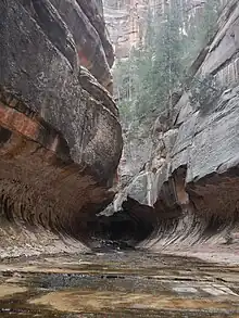 - 🌍 The Narrows. (9.4 mile / 15.1 km round-trip). Trailhead is at the Temple of Sinawava at the end of Zion Canyon, via Riverside Walk. This hike is accessible from Zion Canyon, but the full hike begins in East Zion and ends in Zion Canyon. The Narrows is an extremely popular off-trail hike. The route follows the North Fork of the Virgin River, along the floor of a very narrow canyon with impossibly high walls. This trek is one of the park's most amazing destinations. The full hike is a 16-mile (26-km) one-way trip. The Narrows may close at times due to high waters or flash-flood danger. Wading will be required, so wear footwear and leg coverings that can get wet. Water depth in June 2007 was approximately mid-thigh. The river flows right up to the canyon walls for much of the hike, so you can't avoid wading. The water can be fairly cold and the creekbed is rocky, so your favorite pair of old tennis shoes will probably not cut it. Several outfitters in neighboring Springfield will rent you appropriate footwear, usually heavy-soled neoprene boots. Sturdy hiking poles, which can also be rented, will help navigate the river.