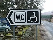 A blue box with the white text WC (β€œwater closet”); but see usage notes.
