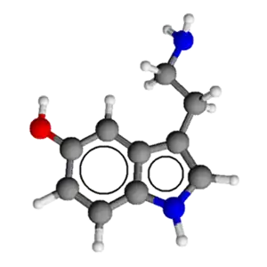Ball-and-stick model of 5-hydroxytryptamine. Grey balls represent carbon atoms; blue balls represent nitrogen atoms; red balls represent oxygen atoms; and white balls represent hydrogen atoms.