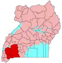 Map of the borders of Ankole (red) within Uganda.