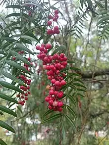 - (US) A South American tree (Schinus molle) grown for its attractive weeping habit and colorful fruits, which are used as a spice called pink peppercorns.