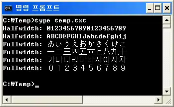 A Korean command prompt in Microsoft Windows, showing halfwidth and fullwidth characters.