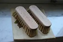 - brush (piece of conductive material, serving to maintain electrical contact between the stationary and rotating parts of a machine)