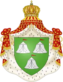 Three pavilions (silver) as charges on a heraldic shield, and one pavilion (red and gold striped) atop the mantling .