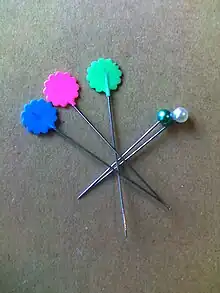 - A needle without an eye (usually) made of drawn-out steel wire with one end sharpened and the other flattened or rounded into a head, used for fastening.