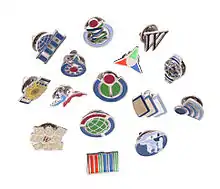 - (US) A simple accessory that can be attached to clothing with a pin or fastener, often round and bearing a design, logo or message, and used for decoration, identification or to show political affiliation, etc.