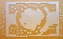 1. jigsaw puzzle (type of puzzle in which the aim is to reconstruct a picture that has been cut (originally, with a jigsaw) into many small interlocking pieces)
